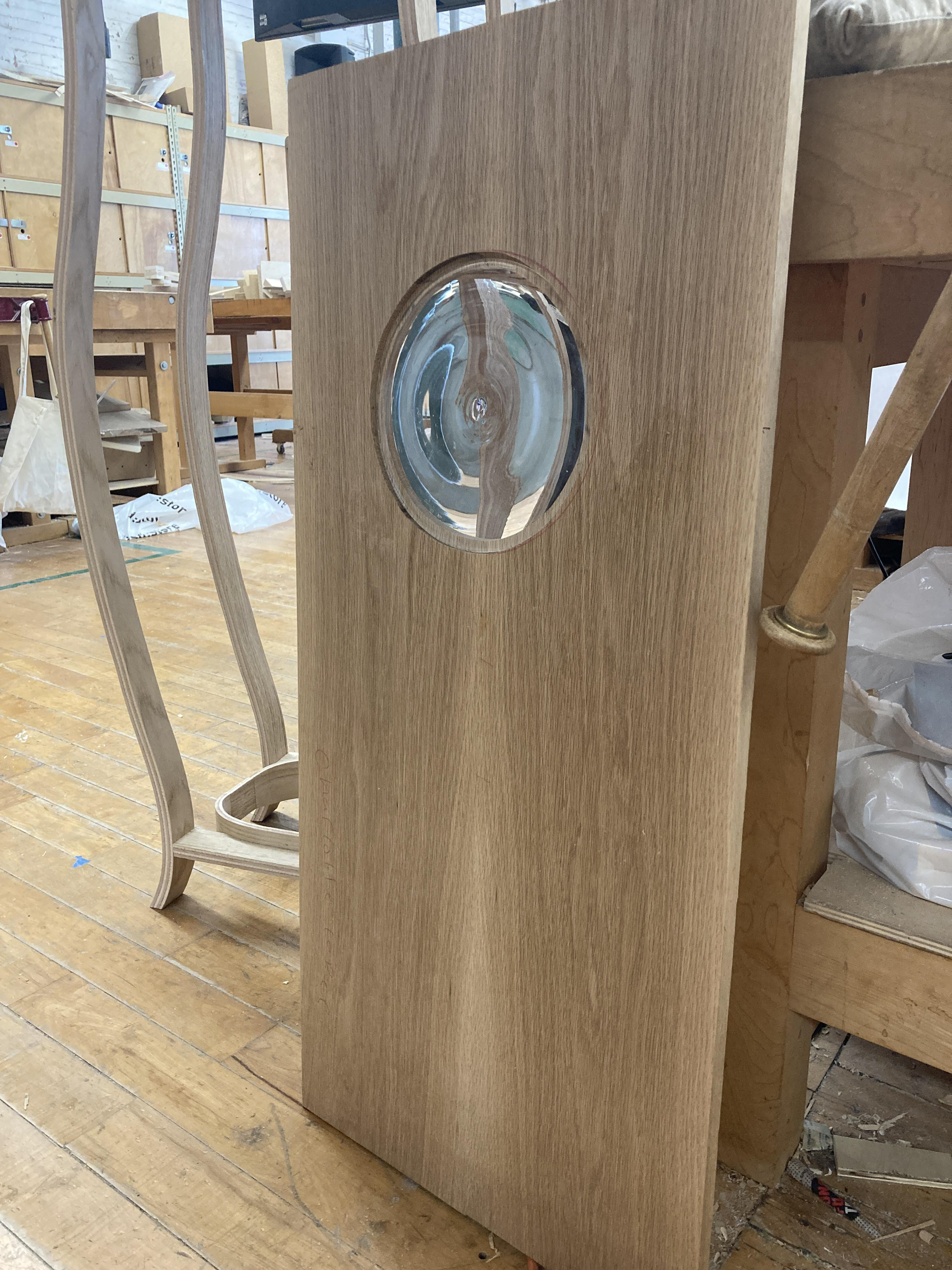 Incepted as the first piece in a series of three, intended to show the relation between glass production as a type of industrial design. This first object is a light constructed entirely of glass with the exception of the light fixture. The form language is largely influenced by the unpredictability of glass with the three outermost “squiggles”being bent around a metal mold and coldworked to be made in connection with each other. These connections create a kind of cradle in which the bubble to be contained in, and when the light is turned on, it interacts not only with the glass on the bubble but also on the supporting “squiggles” to create truly unexpected refractions.